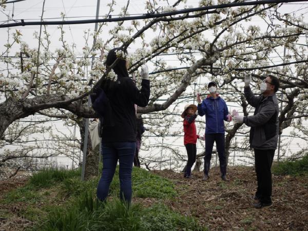 인천시농업기술센터는 코로나19 장기화로 농촌 일손이 부족한 농번기인 4월 13일 직원 42명이 남동구 배 재배 농가들을 찾아가 배꽃 인공수분 일손 돕기를 실시했다.