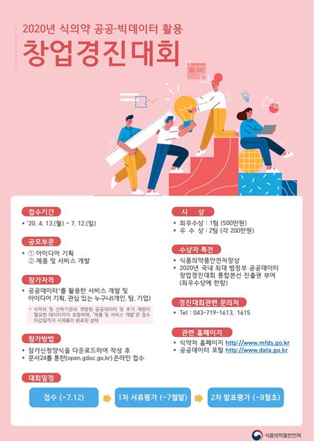 식품의약품안전처(처장 이의경)는 식품.의약품.화장품.의료기기 등의 공공데이터를 활용한 ?년 공공·빅데이터 활용 창업경진대회’를 4월 13일부터 7월 12일까지 3개월 간 개최한다고 밝혔다.