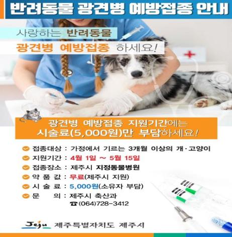 제주시는 반려동물의 광견병 예방과 시민의 안전을 위해 4월 1일부터 5월 15일까지 3개월령 이상의 반려동물(개,고양이)에 대한 광견병 예방접종을 지원한다고 밝혔다.
