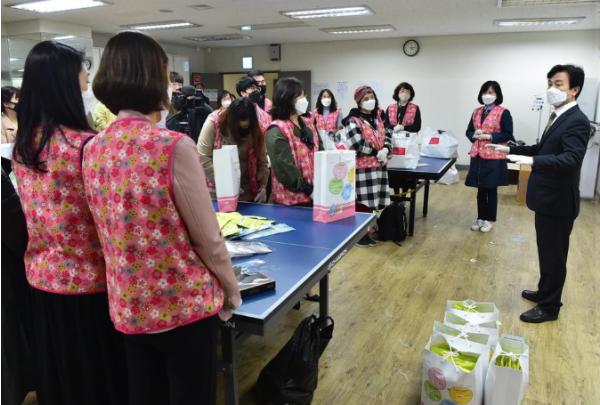 조규일 진주시장은 지난 10일 충무공동 진주시 종합경기장 내 체육회 체력단련실을 방문하여 어린이집 비축용 마스크 개별포장 및 배부작업에 참여한 어린이집 연합회원들을 격려했다.