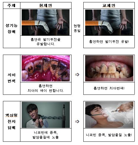 (경고문구) 흡연의 위험성을 강조하고 질병 발생 또는 사망의 위험증가도를 수치로 제시하여 이해도를 높인 현행 주제 전달(메시지) 구성 방식을 유지하되, 실제 문구가 표기되는 담뱃갑의 면적이 작은 점을 감안하여, 문구의 전달력을 높이기 위해 보다 간결하게 표현하였다.