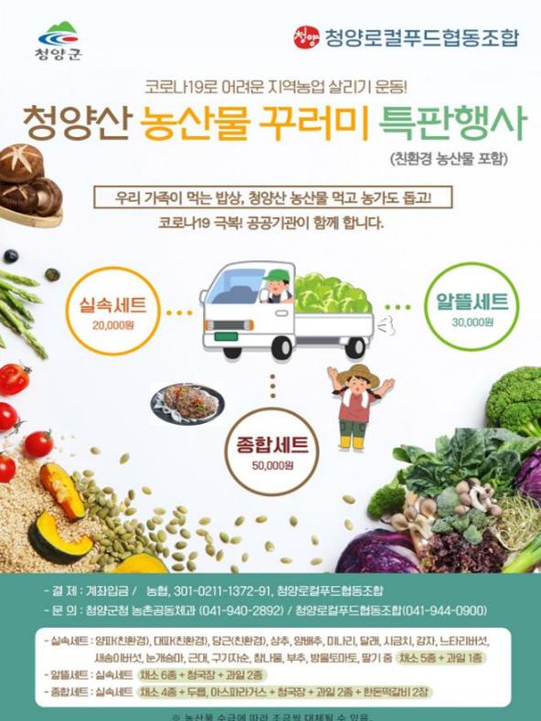교육청, 경찰서, 소방서, 우체국, 농협 등과 함께 추진하는 ‘꾸러미 배송’ 특판 행사는 청양로컬푸드협동조합이 주관하며 3가지 이상의 친환경 농산물을 포함하는 등 품질과 안전성 높은 먹거리를 선보인다.