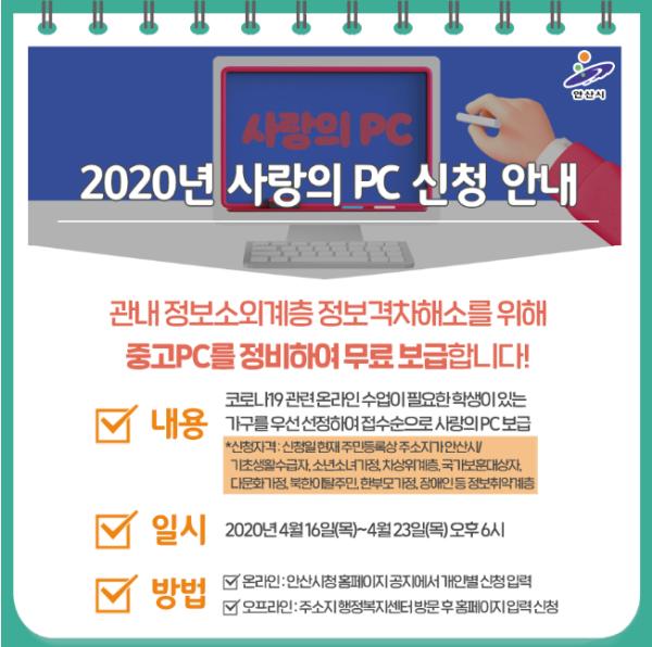 안산시(시장 윤화섭)는 정보소외계층을 위한 ‘사랑의 PC 지원’을 코로나바이러스감염증-19(코로나19) 사태를 맞아 대폭 확대해 추진한다고 14일 밝혔다.