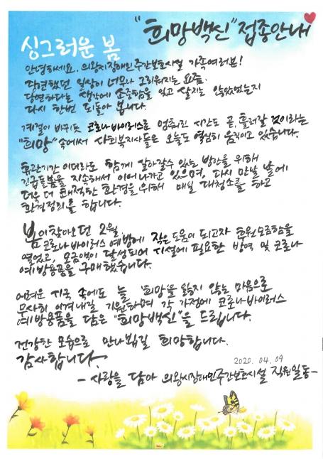 의왕시장애인주간보호시설에서 코로나19 극복을 위해 주간보호시설 이용자 가족에게 ‘희망백신’코로나 예방키트를 전달하며 마음의 방역활동을 펼치고 있다