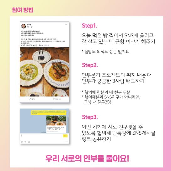 이번 캠페인에 참여하고 싶은 청년은 SNS에 자신의 한 끼 밥상 인증 사진과 함께 근황을 적고, 안부가 궁금한 친구 세 명을 태그하여 릴레이 캠페인 참여를 권유하면 된다.