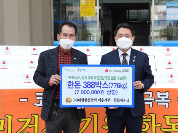 한돈협회 여수시지회(회장 김윤곤)는 지난달 30일 여수시청에서 코로나19 위기 극복을 위한 국민건강기원 한돈나눔행사를 통해 7백만 원 상당의 한돈 388박스를 여수시(시장 권오봉)에 전달했다.