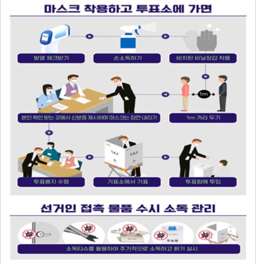 한편, 중앙선관위 관계자는 “코로나19로 인한 국가적 위기 상황에서도 유권자가 안심하고 소중한 투표권을 행사할 수 있는 환경을 조성하기 위해 최대한 노력하였다.”며, 모든 유권자는 ‘투표소에 가기 전 꼼꼼히 손 씻기’, ‘마스크와 신분증 준비하기’, ‘투표소 안·밖에서 대화 자제 및 1m이상 거리 두기’ 등 ‘4·15 총선 투표참여 국민 행동수칙’을 반드시 준수해 줄 것을 당부하였다.