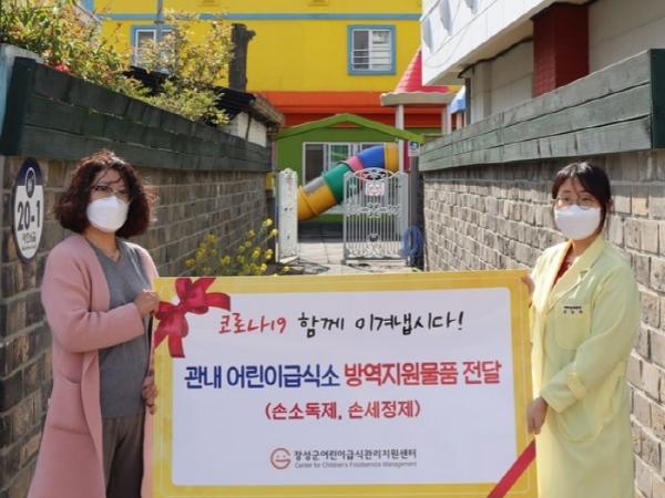 장성군이 어린이 급식소에 500만원 상당의 방역물품을 지원했다.