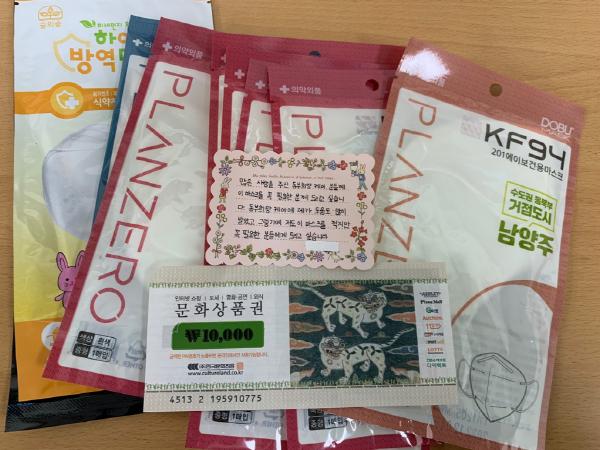 지난 23일 동부희망케어센터에 한 시민이 “평상시 사랑을 많이 받았습니다. 어려운 시기 꼭 필요한 사람에게 전달 부탁드린다”는 손편지와 함께 마스크 10매와 문화상품권 1매를 기부했다.