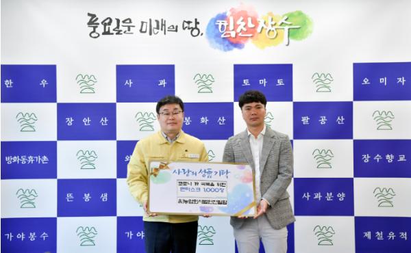 유한회사농업회사법인 진필팜 전제영 대표가 4월 10일 군청을 방문해 코로나19 확산예방을 위한 면마스크 1,000장(1,500만원 상당)을 장수군에 전달했다.