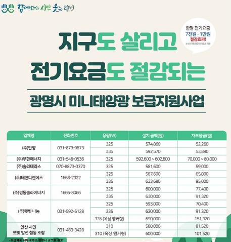 광명시 관계자는 “당면한 기후위기 극복을 위해 재생에너지 보급에 시민들의 자발적인 참여가 큰 힘이 될 것”이라며 “경제적 효과뿐만 아니라 환경적으로도 공헌도가 큰 미니태양광 보급지원 사업을 지속적으로 추진하여 에너지 자립도시 조성을 위해 힘쓰겠다”고 말했다.