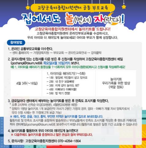 고창군육아종합지원센터가 코로나19확산 방지에 따른 공통 부모교육 대체사업인 ‘집에서도 놀(면서) 자(란다)!’을 진행한다.