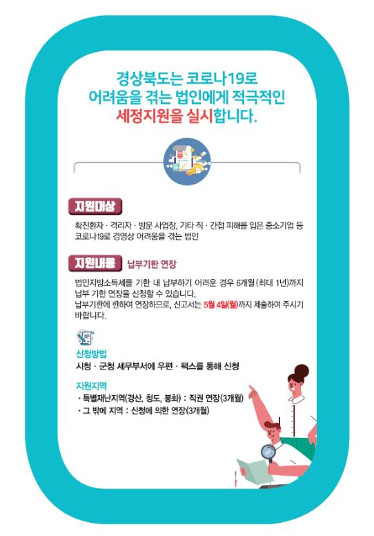 법인지방소득세 신고·납부 기한은 당초 5월 4일까지였으나 ‘코로나19’로 인한 직·간접 피해로 경영상 어려움을 겪고 있는 법인은 신청에 의해 납부기한을 7월 31일까지 3개월 연장할 수 있다.
