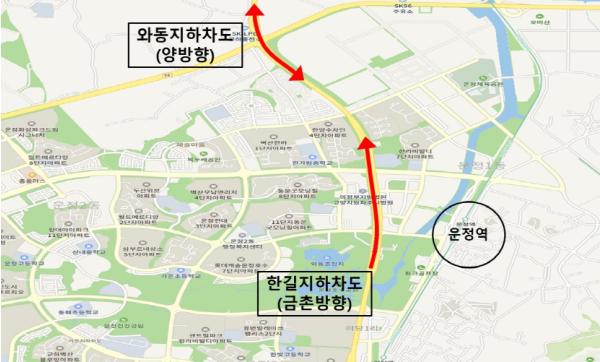 22시부터 다음날 오전 6시까지, 와동지하차도는 양방향, 한길지하차도는 금촌방향 차도를 전면 통제한다.