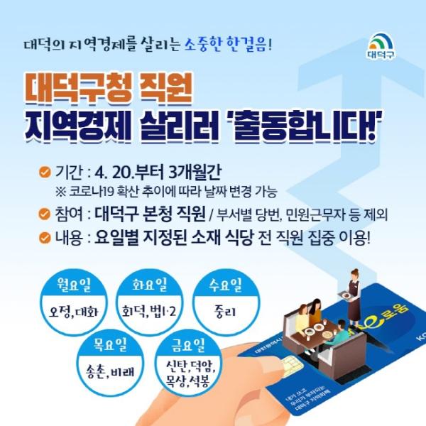 식당 운영이 중단됨에 따라 구청 직원 800명은 매일 요일별로 지정된 지역의 음식점에서만 점심식사를 하게 된다. 12개 행정동을 5개 권역으로 나눠 월요일에는 오정·대화동, 화요일에는 회덕·법1·2동 등 요일별로 지정된 지역의 음식점을 찾아가 식사를 하는 방식이다.