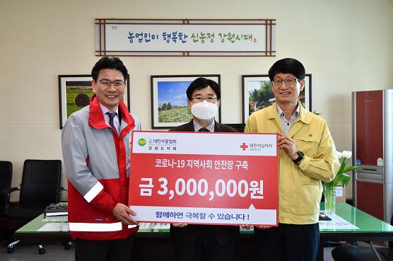 (사)대한곡물협회 강원도지회(지회장 함상옥)는 3월 31일 강원도청에서 도내 코로나19 피해지역의 의료진, 환자 등에 대한 의료용품 및 구호물품 지원을 위한 구호성금 300만원을 대한적십자사 강원지사에 전달하였다.
