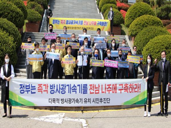 16일 다목적 방사광가속기 유치 시민 추진단(단장 정찬용, 이건철)은 나주시청 정문에서 ‘다목적 방사광가속기 나주 구축’을 촉구하는 성명서를 발표하고 과학기술발전에 기반한 호남권 균형발전을 강조했다.