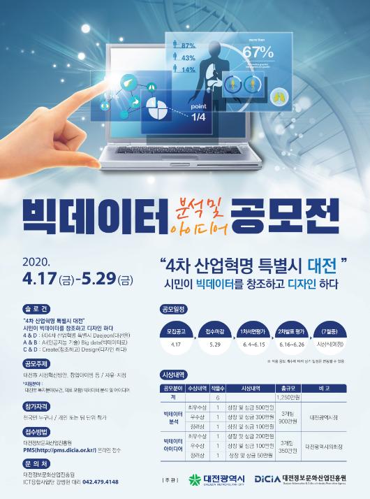대전시와 (재)대전정보문화산업진흥원(이하 진흥원)은 ‘2020 빅데이터 분석 및 아이디어 공모전’을 개최한다고 17일 밝혔다.