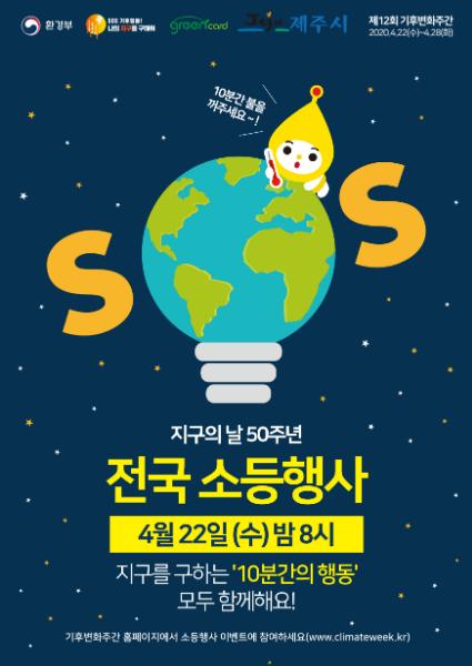 제주시는 지구의 날(4월 22일)을 기념해‘SOS 기후행동! 나의 지구를 구해줘’라는 주제로 22일부터 28일까지 환경부에서 지정한 기후변화주간동안 소등행사를 추진한다.
