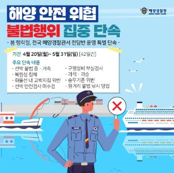 해양경찰청(청장 김홍희)은 봄 행락철 선박 이용객이 많은 시기에 국민의 해양안전을 위협하는 불법행위를 오는 4월 20일부터 5월 31일까지(42일간) 집중 단속한다고 17일 밝혔다.