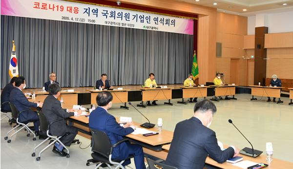 대구시는 17일 오후 3시 대구시청 별관 대강당(1층)에서 지역의 국회의원과 기업인들이 한자리에 모인 가운데 코로나19 방역상황을 공유하고 지역경제대책을 논의하는 연석회의를 개최했다.
