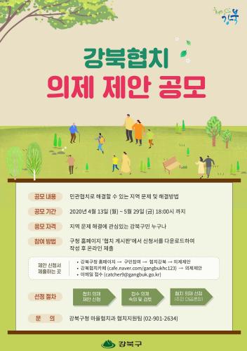 강북구(구청장 박겸수)가 주민들의 구정 참여 기회를 보장하고 폭넓은 지역 문제를 발굴하기 위해 5월 29일(금)까지 협치 의제를 공모한다.