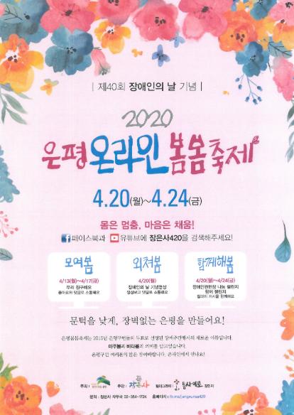서울 은평구(구청장 김미경)는 '제40회 장애인의 날'을 기념해 20일부터 24일까지 온라인을 통해 '2020년 은평온라인봄봄축제'를 개최한다고 밝혔다.