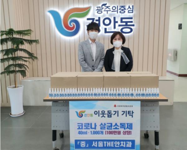 광주시 경안동에 있는 서울THE안치과(원장 안교진)는 지난 16일 경안동행정복지센터를 방문, 코로나19의 지역사회 확산방지 및 저소득층을 위해 써달라며 살균소독제 1천개(40㎖·100만원 상당)를 기탁했다.