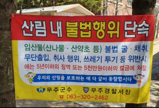 무주군에 따르면 군 홈페이지와 현수막 등을 통한 홍보와 현장 출장을 통한 산나물, 산약초 등 임산물 불법 채취(관광업체 또는 산악회 · 동호회를 통한 임산물 불법채취 행위, 희귀식물 서식지 · 산나물 집단 생육지 주변 채취 행위), 조경용 수목 무허가 굴취 및 훼손 행위 등을 집중 단속한다.