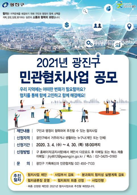 광진구(구청장 김선갑)가 정책 결정의 모든 과정에 구민이 직접 참여할 수 있는 2021년 광진구 민관협치 사업 공모에 나섰다.