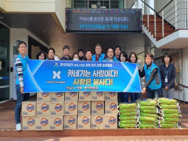 한국카네기 이천·여주·양평 총동문회는 어려운 가정의 집수리, 대청소 등 지속적으로 사회봉사활동을 해왔으며, 코로나19로 인해 대면활동이 어려워져 이번에는 기부물품 전달로 사회봉사활동을 하기로 했다.