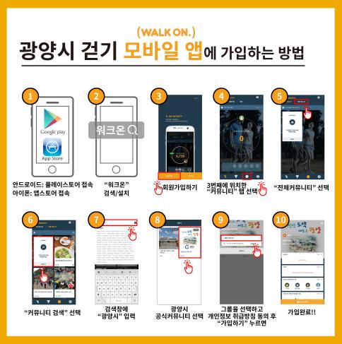 참여 방법은 모바일 앱 워크온 설치 후 광양시 공식커뮤니티(소그룹 읍면동 선택)에 가입하고 광양시 챌린지에서 ‘예약하기 또는 시작하기’를 누른 후 휴대폰을 소지하고 걸으면 되며, 광양시민 누구나 참여할 수 있다.