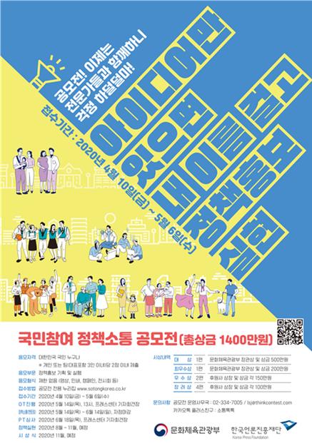 문화체육관광부(장관 박양우, 이하 문체부)는 각 부처 정책 담당자들이 국민과 함께 정책을 직접 홍보하는 ?국민참여 정책소통 공모전(4. 10.~5. 6.)’을 진행한다.