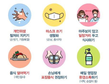 생활 속 방역 실천을 위한 음식점 식사 지침은 △개인접시 사용 △이용자 사이 또는 이용자와 종사자간 거리유지 △마스크 쓰기 △종사자 건강관리 △영업장 수시 소독하기 등이 요구된다.