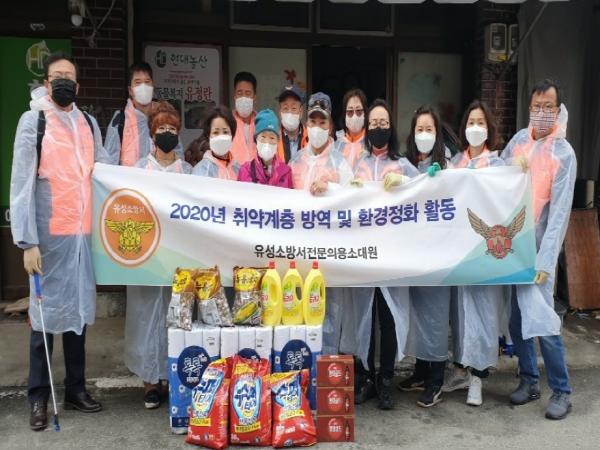 유성소방서전문의용소방대는 코로나19 확산방지를 위해 역사, 터미널을 비롯해 유성전통시장 내 상가 출입구에 대해 방역을 실시했으며, 어려움을 겪고 있는 주변 취약계층 가정을 방문해 주방세제와 화장지 등 생필품도 전달했다.