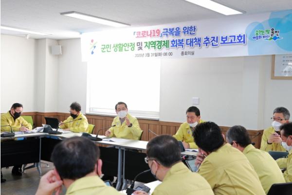 울진군(군수 전찬걸)은 코로나19 여파로 어려움에 처한 지역경제를 되살리기 위해 3월 31일 「코로나19」 피해극복을 위한 군민생활 안정 및 지역경제 회복 대책 추진 보고회를 개최했다.