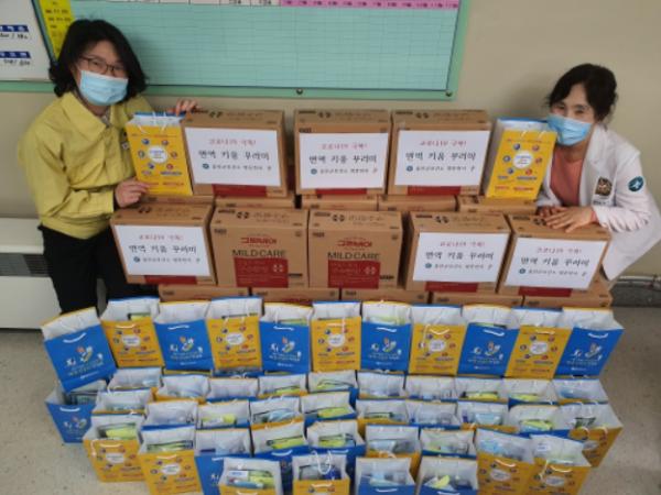 면역 키움 꾸러미는 코로나19 행동수칙과 마스크, 손소독제, 그린비아(영양식품), 물티슈, 일회용밴드 등 건강에 필요한 자료와 물품을 비대면 방식으로 전달하였다
