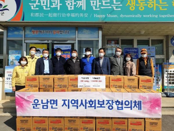 무안군 운남면 지역사회보장협의체(공동위원장 박종학, 박문재)는 지난 21일 운남면 자율방범대(대장 김용환)로부터 코로나19 극복을 위해 150만원 상당 라면 60박스를 기탁 받았다고 밝혔다.