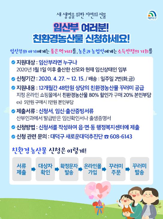 지원대상은 대덕구 관내 거주자 중 2020년 1월 1일 이후 출산한 산모와 현재 임신상태인 임부다. 신청기간은 오는 27일부터 12월 15일까지이며 지원내용은 12개월간 48만원 상당의 친환경농산물 꾸러미를 가정에 제공하는 것으로, 지정된 온라인 쇼핑몰을 통해 친환경농산물을 80% 할인된 가격으로 구매할 수 있고 산모는 결제금액의 20%만 자부담하면 된다.