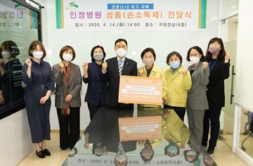 은평구(구청장 김미경)는 산부인과 전문병원인 인정병원(병원장 김병인)에서 “코로나19 지역사회 확산 방지를 위해 저소득층 주민 및 사회복지시설로 배부해 달라”며 지난 14일(화) 손소독제 500개를 후원받았다고 밝혔다.