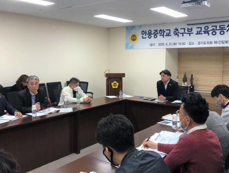 경기도의회 교육행정위원회 황대호 의원(더불어민주당, 수원4)은 21일 경기도의회 제1간담회실에서 안용중학교 축구부 학부모와 학교 및 교육청 관계자들과 함께 안용중학교 축구부 해단 문제 논의을 위한 긴급 간담회를 개최하였다.