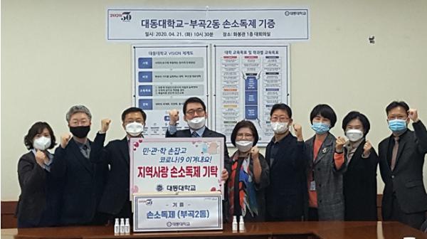 대동대학교(총장 배순철)는 지역사랑 실천과 코로나19 극복을 위해 지난 21일 금정구(구청장 정미영) 부곡2동에 교내 두피&모발연구소에서 자체 개발한 손소독제 325개를 전달하였다. 손소독제는 관내 취약계층 325세대에 배부될 예정이다.