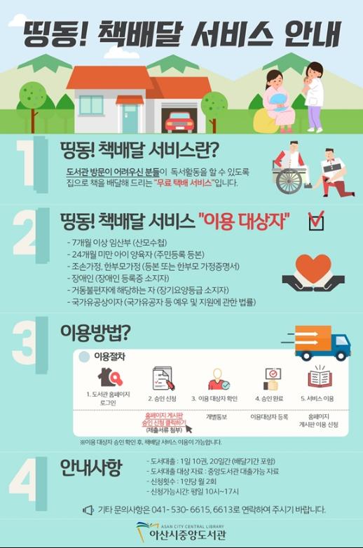 아산중앙도서관은 4월 22일부터 코로나19 ‘띵동! 책배달’ 서비스를 확대 시행한다.