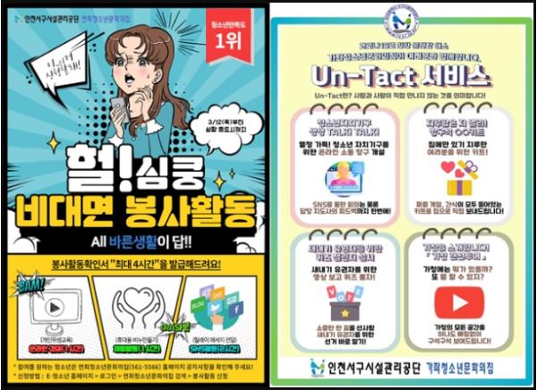 아울러 검단청소년문화의집은 ‘방구석 키트’(초등 대상 과학 실험 키트), ‘재능나눔 봉사활동 프로그램’(책 번역 활동) 등을 제공하며 연희청소년문화의집은 ‘SNS 봉사활동’(선플 운동), ‘자기개발 활동 프로그램’(비대면 아이디어 제안 등) 등의 프로그램을 진행한다.
