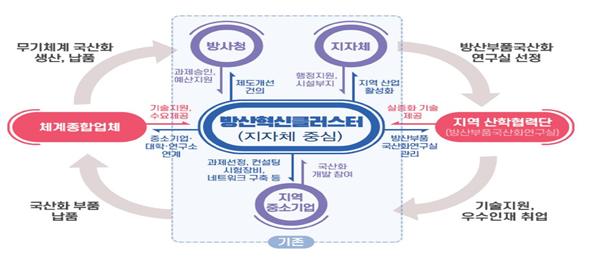 방위사업청은 우수기업들이 방위산업에 적극적으로 참여하도록 유도하고, 지자체·체계기업·중소기업·대학·軍 등 지역혁신 주체들을 한 데 모아 지역별, 산업별 협력 생태계를 구축하는 ‘방산혁신클러스터’ 시범사업을 추진 중이다.