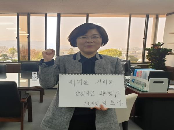 23일, 안성시에 따르면 김 시장은 코로나19 여파로 어려움을 겪고 있는 주민들에게 희망의 메시지를 전달하기 위해, 본인의 SNS에 ‘위기는 기회, 안성시민 파이팅’이라는 손글씨 문구를 들고 찍은 사진을 게재했다.