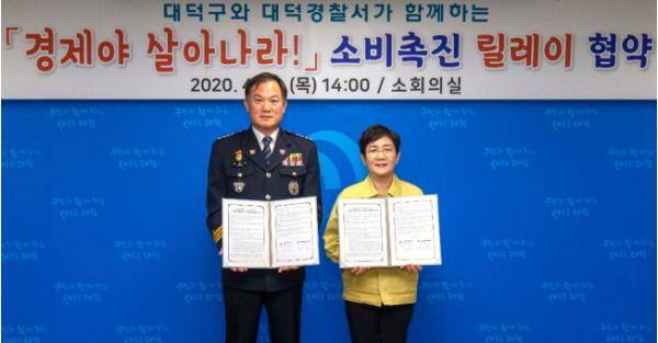 대전 대덕구(구청장 박정현)가 23일 구청에서 코로나19 영향으로 인한 경기침체 상황을 극복하기 위해 대덕경찰서(서장 변관수)와 ‘경제야 살아나라!’ 소비촉진 릴레이 협약을 체결했다.