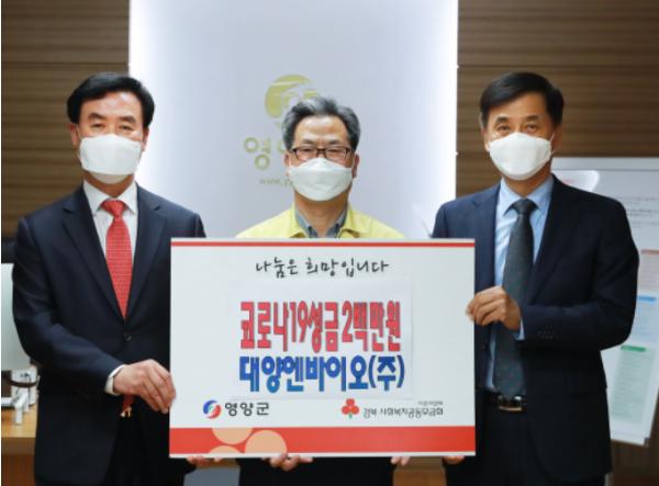 대양엔바이오(주)(대표 박종운)는 4월 22일 영양군청을 방문하여 200만원의 성금을 기탁하며 코로나19 극복에 동참하였다.