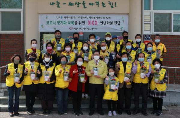 영동군자원봉사센터가 코로나19 사태로 불편과 어려움을 겪고 있는 군민들을 위해 꽃 화분을 나누며 지역사회 곳곳에 웃음과 행복을 전하고 있다.