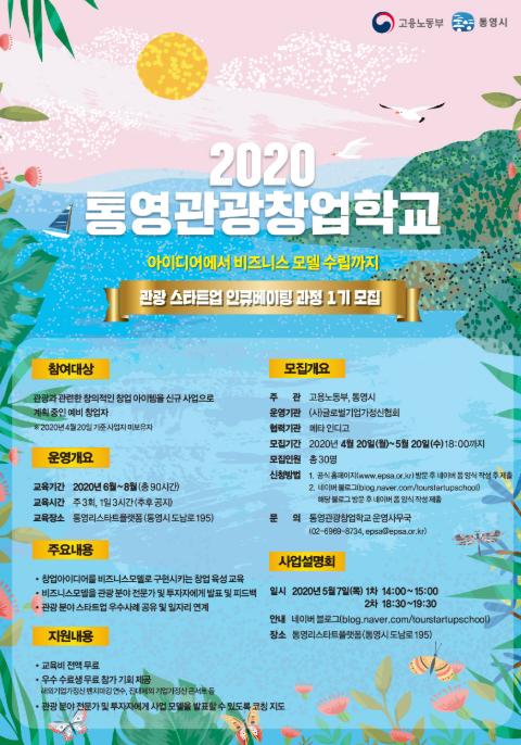 통영시는 지난 2월 고용노동부의 지역·산업맞춤형 일자리창출 지원 공모사업으로 선정된「통영관광창업학교 운영사업」참여자를 모집한다.